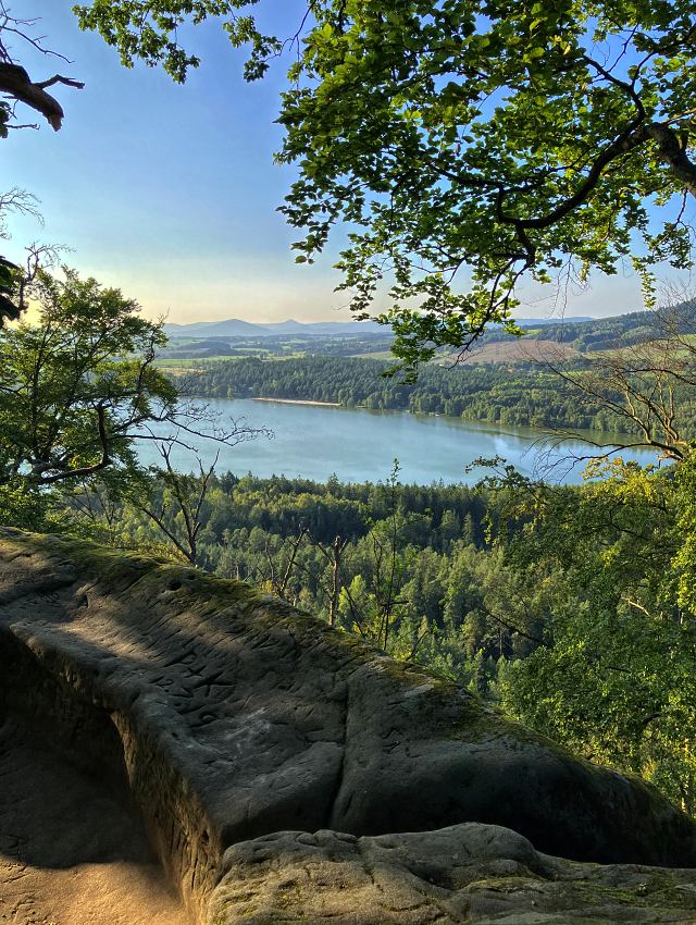 Po prohlídce hradu nasedám na kolo užívám si parádní sjezd z kopce až na břeh Hamerského jezera. Dále pokračuji po místní cyklostezce do Stráže pod Ralskem, kde v místním občerstvení přímo u vodní nádrže doplňuji tekutiny a vyrážím směrem do Novin pod Ralskem, kde mě čeká krátká zastávka u sklaní Průrvy Ploučnice. Následně pokračuji po relativně málo frekventované silnici směrem do Velkého Grunova. Na cestě po krátkém prostudování mapy ovšem raději volím cestu přes les, kde se Velkému Grunovu vyhnu. Ohlížím se zpět na dominantní kopec Ralsko, který jsem během dnešního cyklovýletu postupně objížděl a vyrážím směrem k blízké obci Brniště.