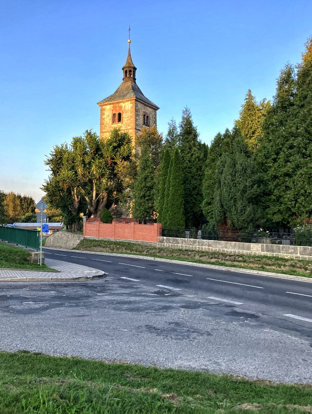 Vydávám se po klidné lesní cestě v okolí kopce Holička, kde jsem po několika metrech narazil na žlutou turistickou trasu. Po dosažení blízké silnice pokračuji v jízdě do Brniště, odkud se po krátké zastávce u místního kostela vydávám směrem do obce Velenice. Cestou za Brništěm mě ovšem čeká výstup na místní kopec s vysílačem (352 m n. m.), který mě s ohledem na právě ujetých 70 km už příliš nebaví (tady bych výpomoc od elektrokola už rozhodně ocenil). A to jsem navíc netušil, že mě cestou čeká ještě mnohem náročnější výstup.