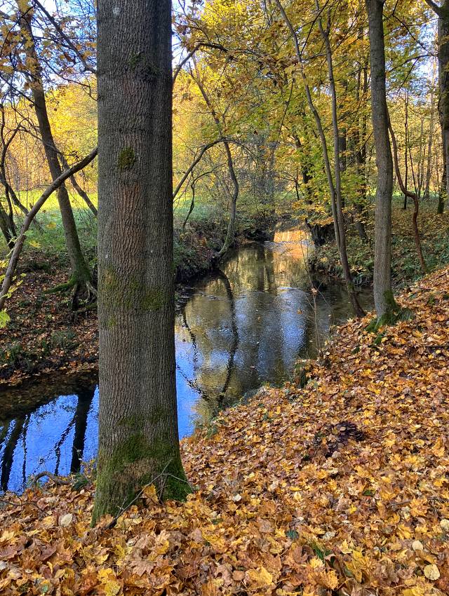 Po chvíli na cestě nacházím odstavené kolo a pokračuji průjezdem tohoto kouzelného údolí až k místu, kde je další část podzemního náhonu. V těchto místech skalou protéká říčka Svitavka a výpusť je zakončena malým jezem. Po žluté turistické značce pokračuji průjezdem údolí až do blízké obce Svitava. Napojuji se na místní silnici a po chvíli projíždím následující vesnicí Lindava, kde mám naplánovanou trasu přes neznačenou stezku mezi poli, ze které se vyklube nepříliš pohodlná jízda po stopách zemědělské techniky. Ze špatně viditelné cesty jsem totiž hned na začátku nechtěně sjel a dva kilometry se trápil v těžkém terénu.